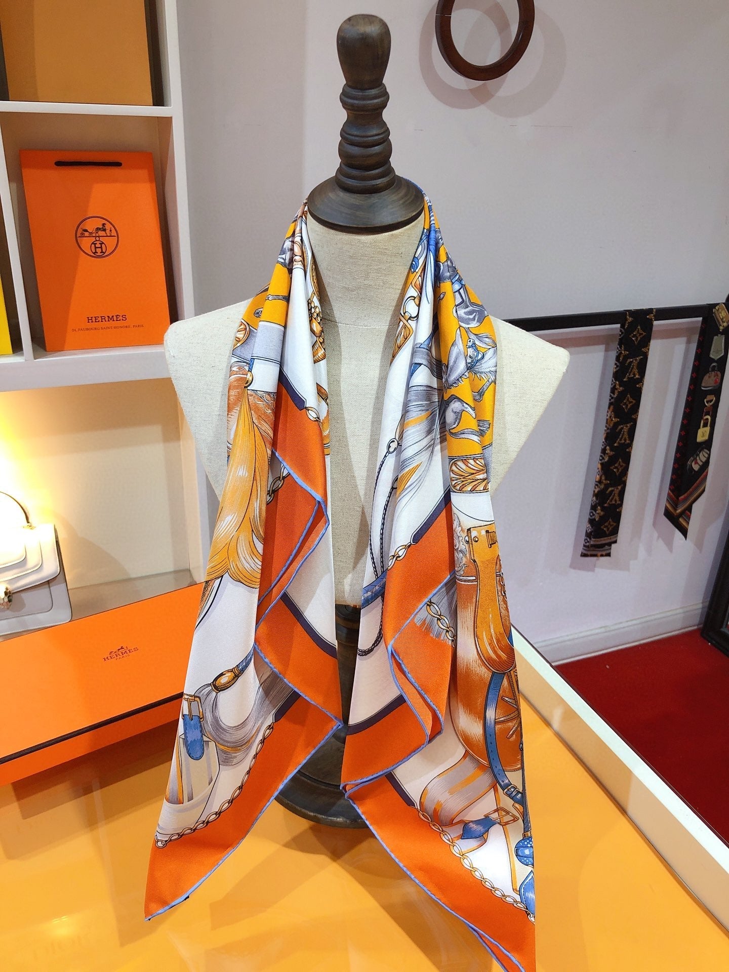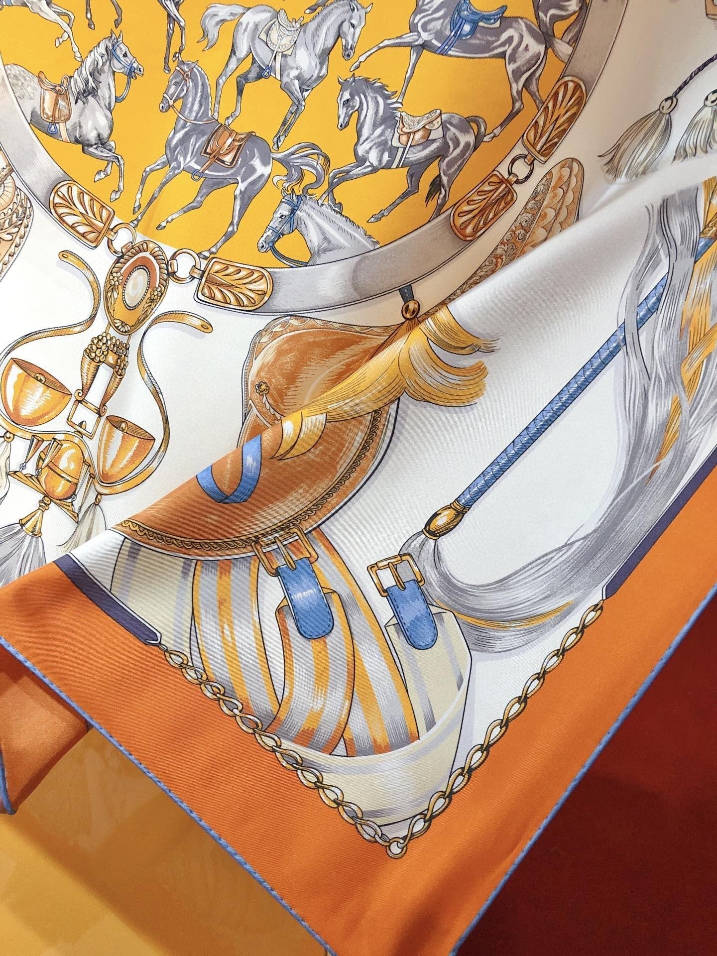 Cavalcades Scarf 90 CM In White Orange Colorful Silk Twill 288858