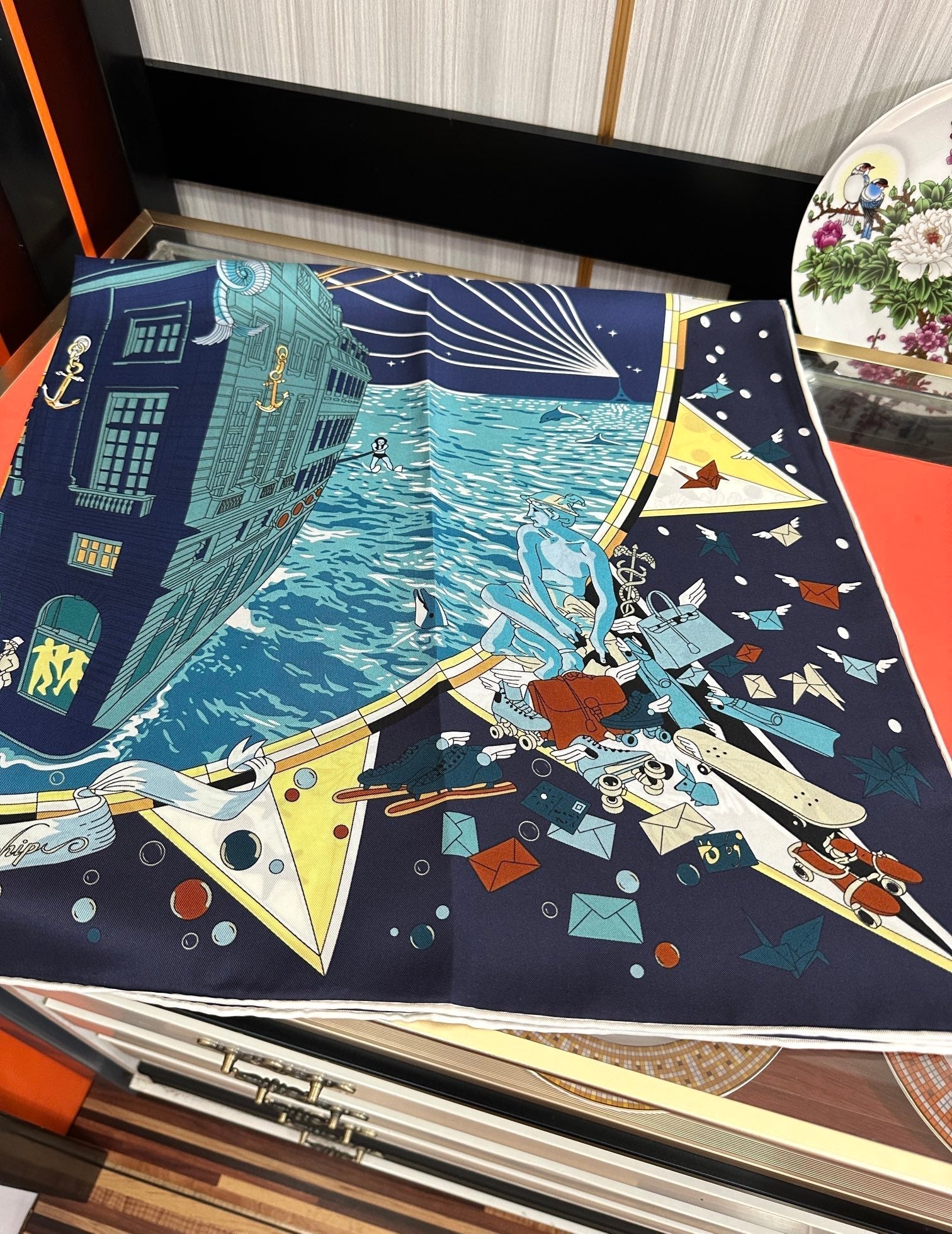 Flagship Silk Scarf 90 CM Charcoal Blue Colorful