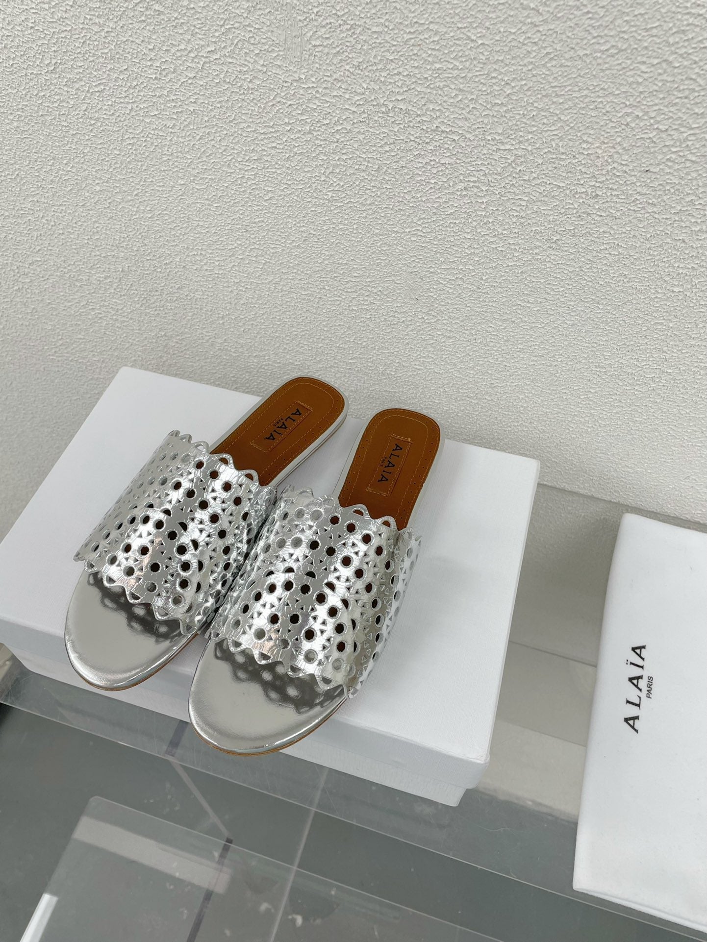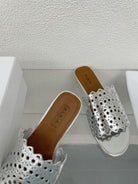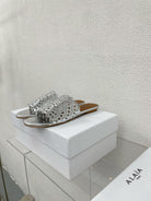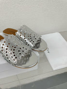 ALAIA VIENNE FLAT MULES IN SILVER LAMBSKIN