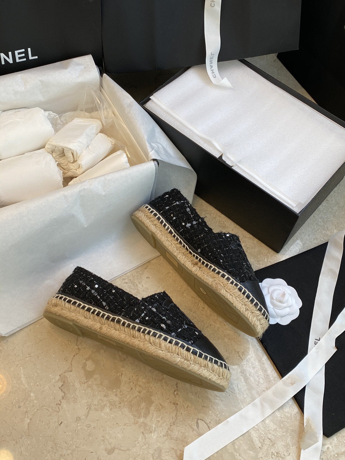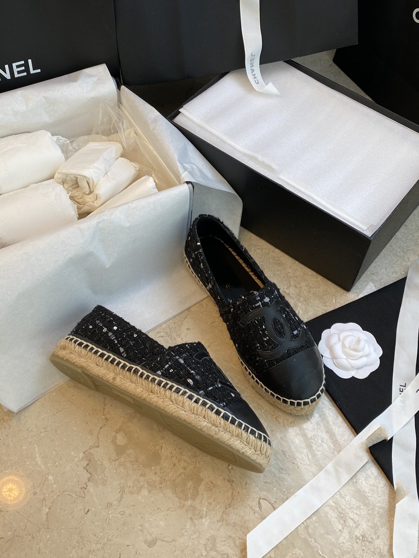espadriles black white tweed black lambskin