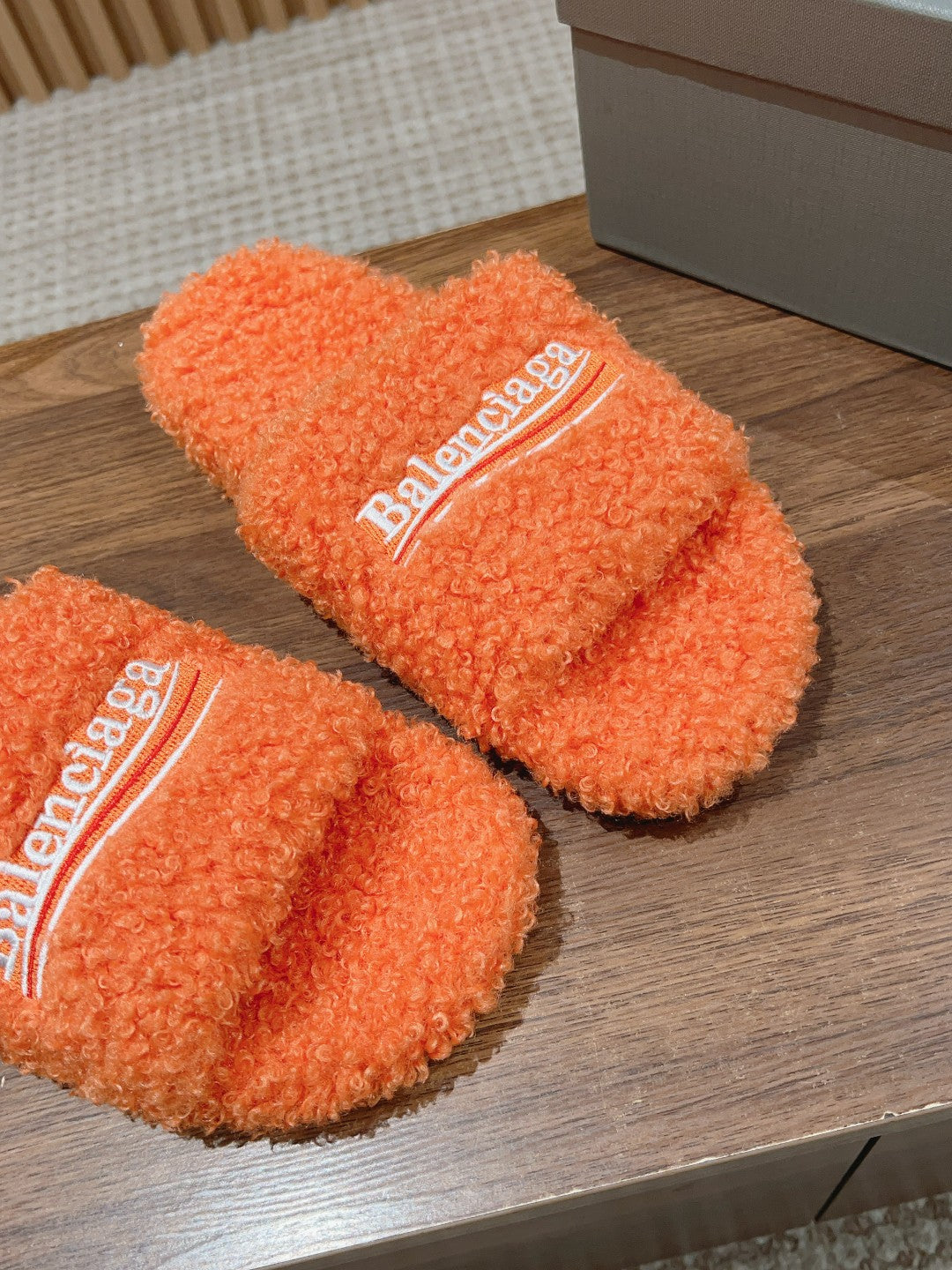 FURRY SLIDES IN ORANGE CURLY SHEARLING
