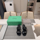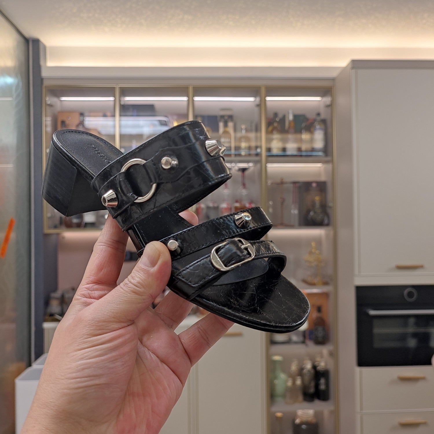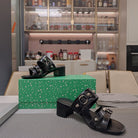 STRAPPY MEDIUM HEELED SANDALS IN BLACK STUDDED WAX-OIL SHEEPSKIN