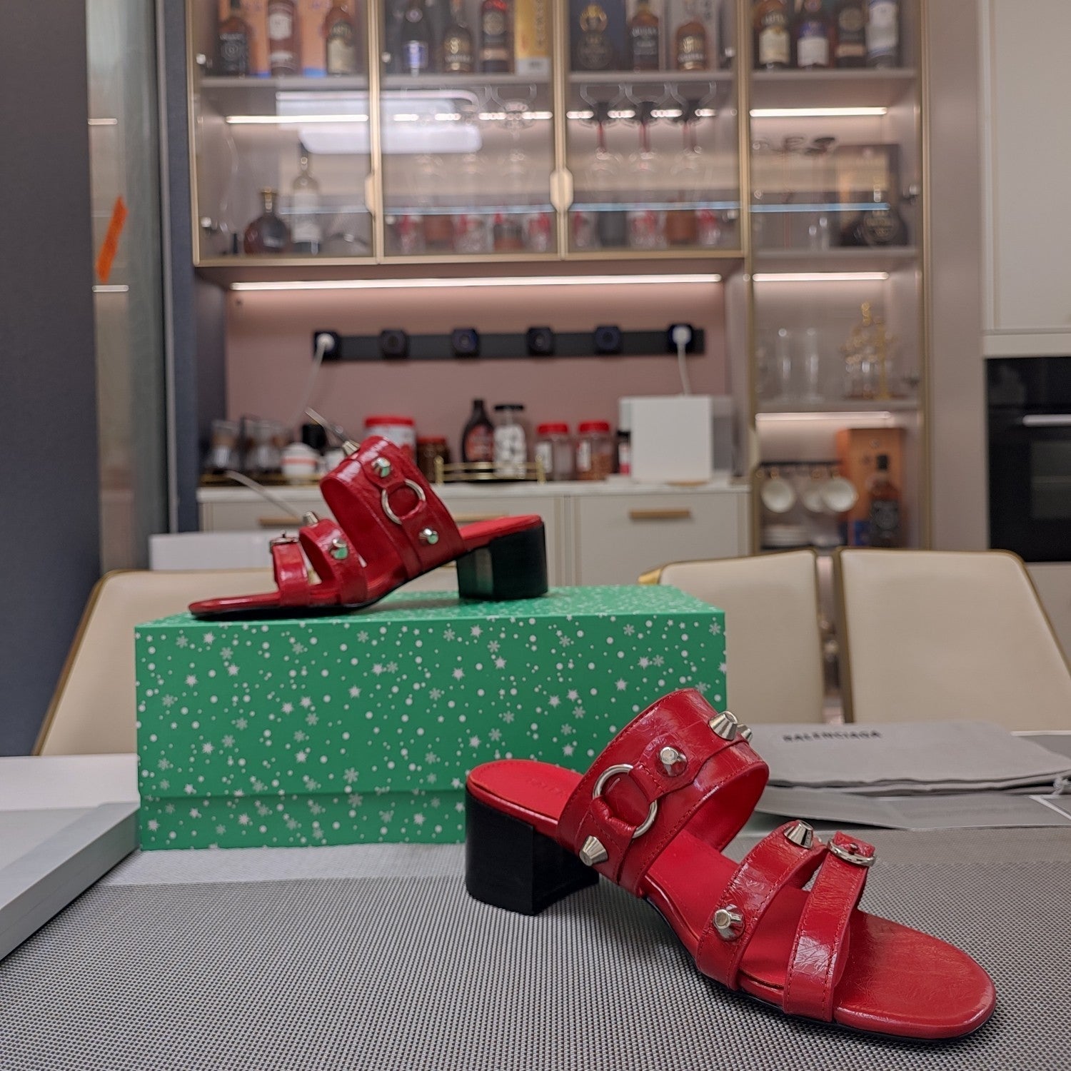 STRAPPY MEDIUM HEELED SANDALS IN RED STUDDED WAX-OIL SHEEPSKIN