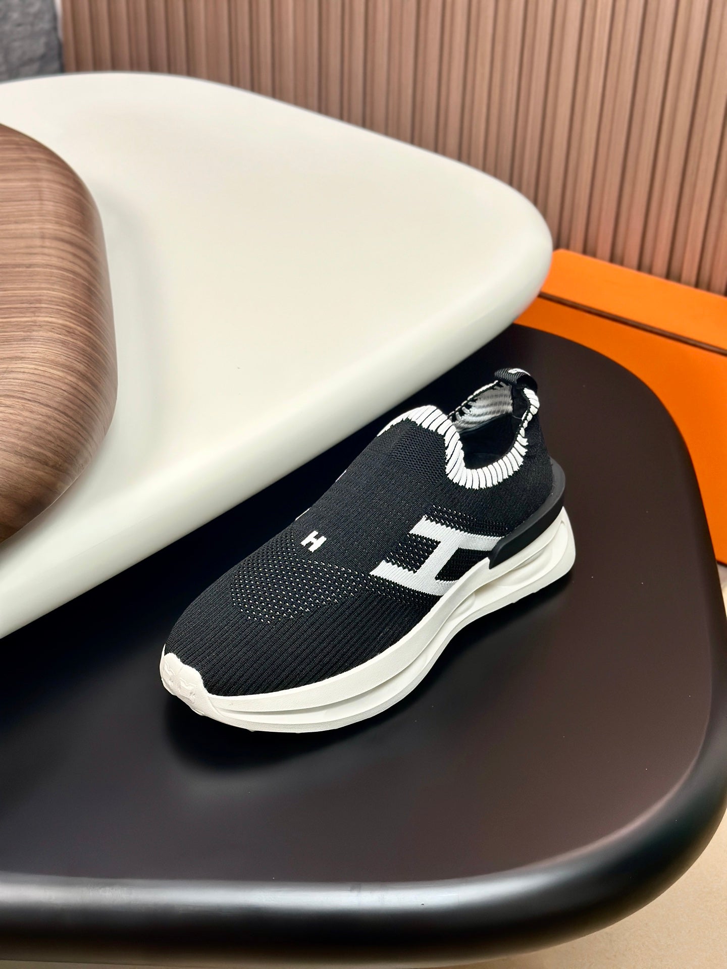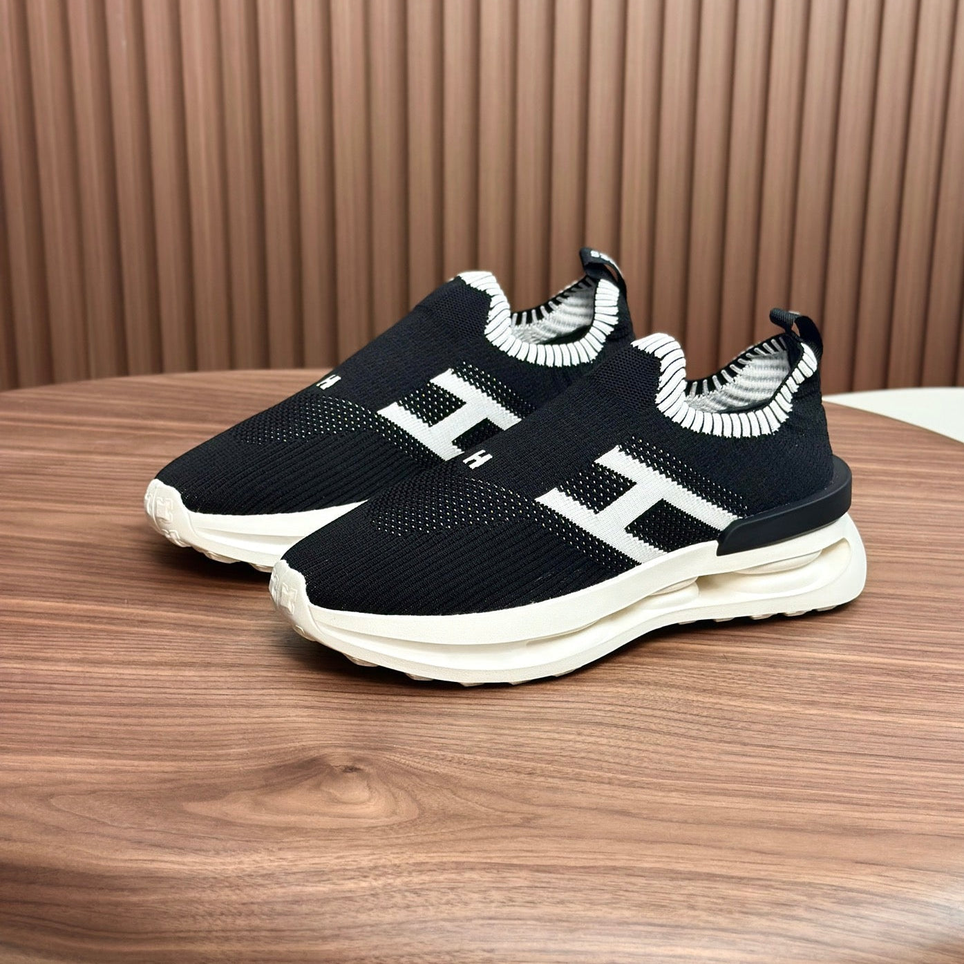 HM Men's Slip on Sneaker Black White Flyknit Fabric 690059