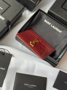 YSL Card Holder 10cm Wallet Burgundy Gold Crocodile Leather 240559