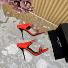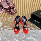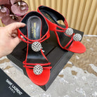 SL POM CIRCLE CRYSTAL HEELED SANDALS RED SATIN