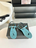 SL Silk Bow T-Strap Flat Sandals Cloud Blue Leather
