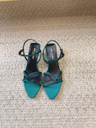 STRAPPY MID HEEL SANDALS IN TEAL GREEN SILK