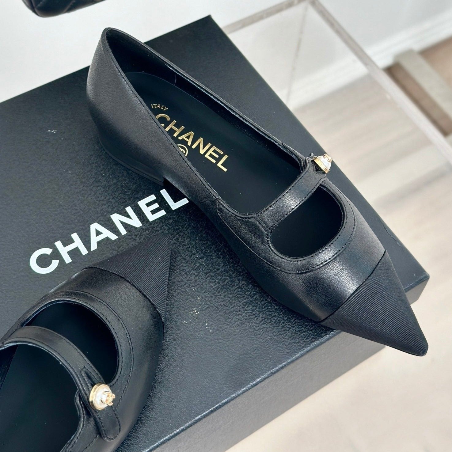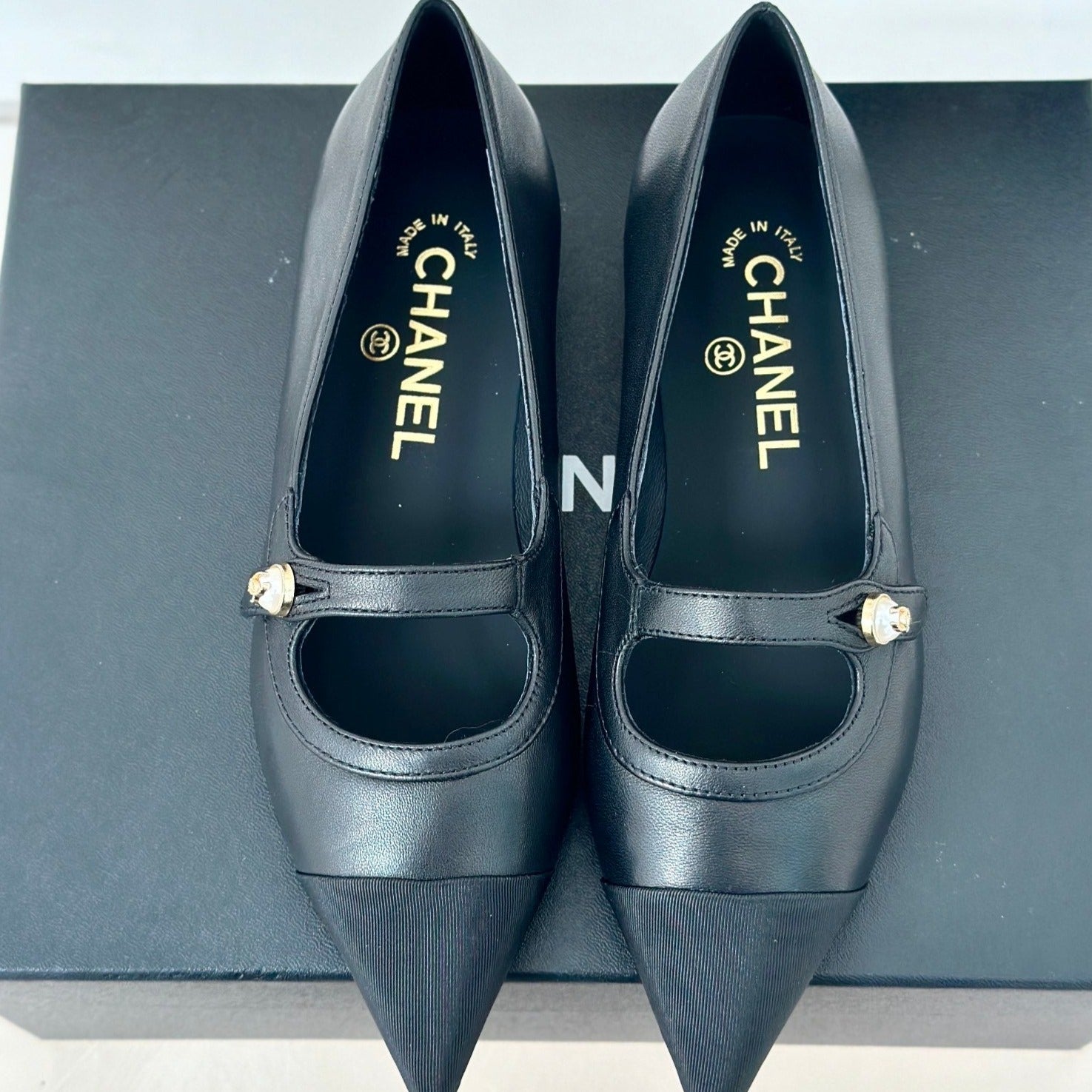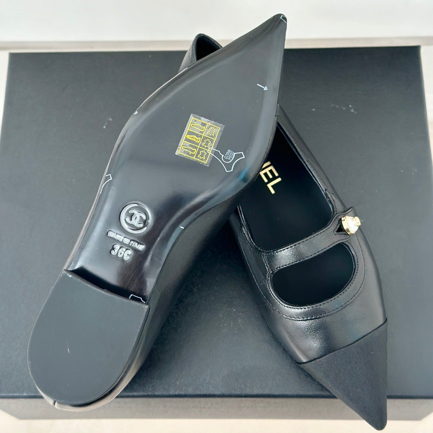 cc mary jane pointed toe black calfskin grosgrain