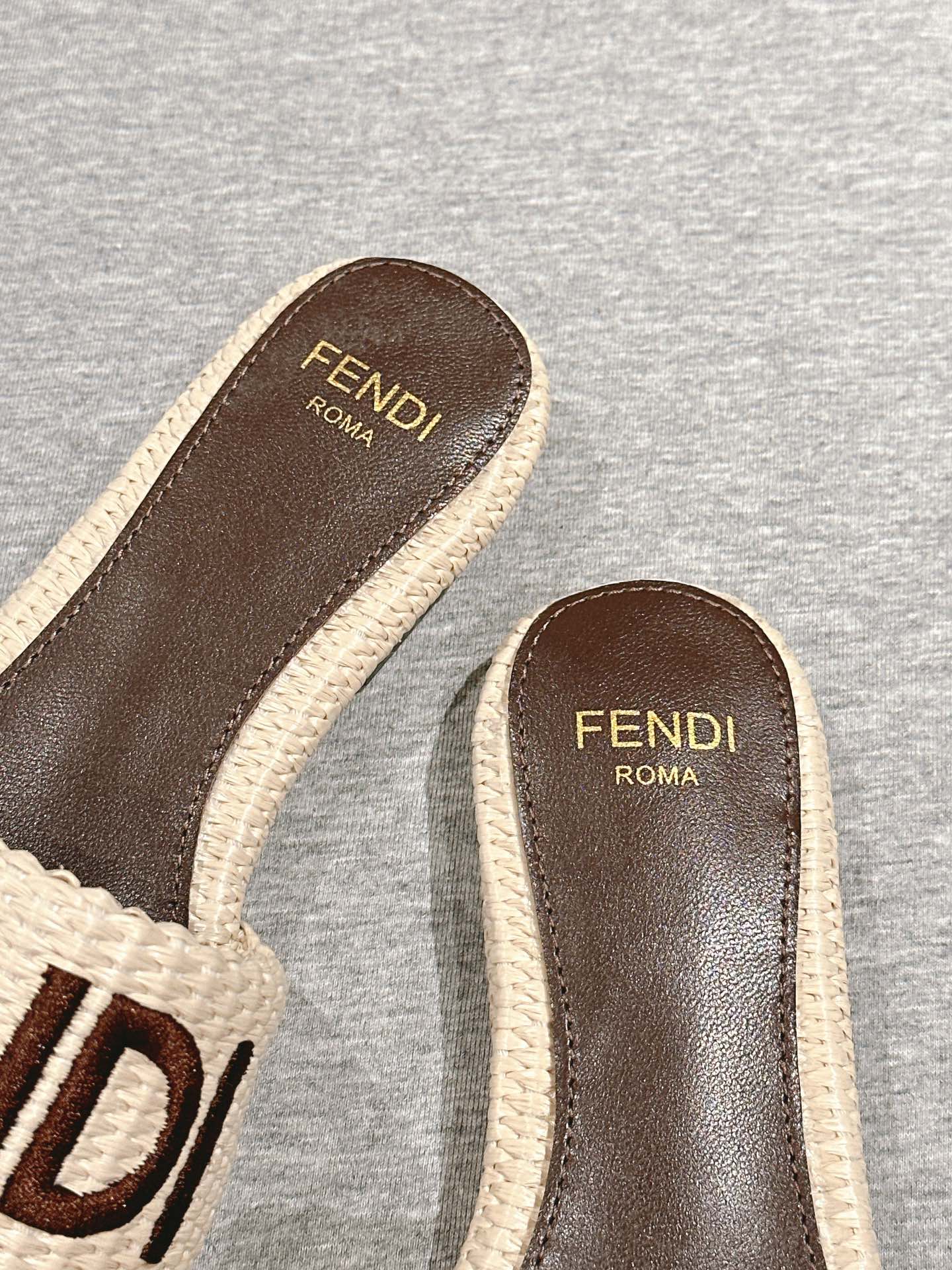 FENDI SIGNATURE MULE SLIDES IN WHITE FIBRE WITH BROWN EMBROIDERED LOGO