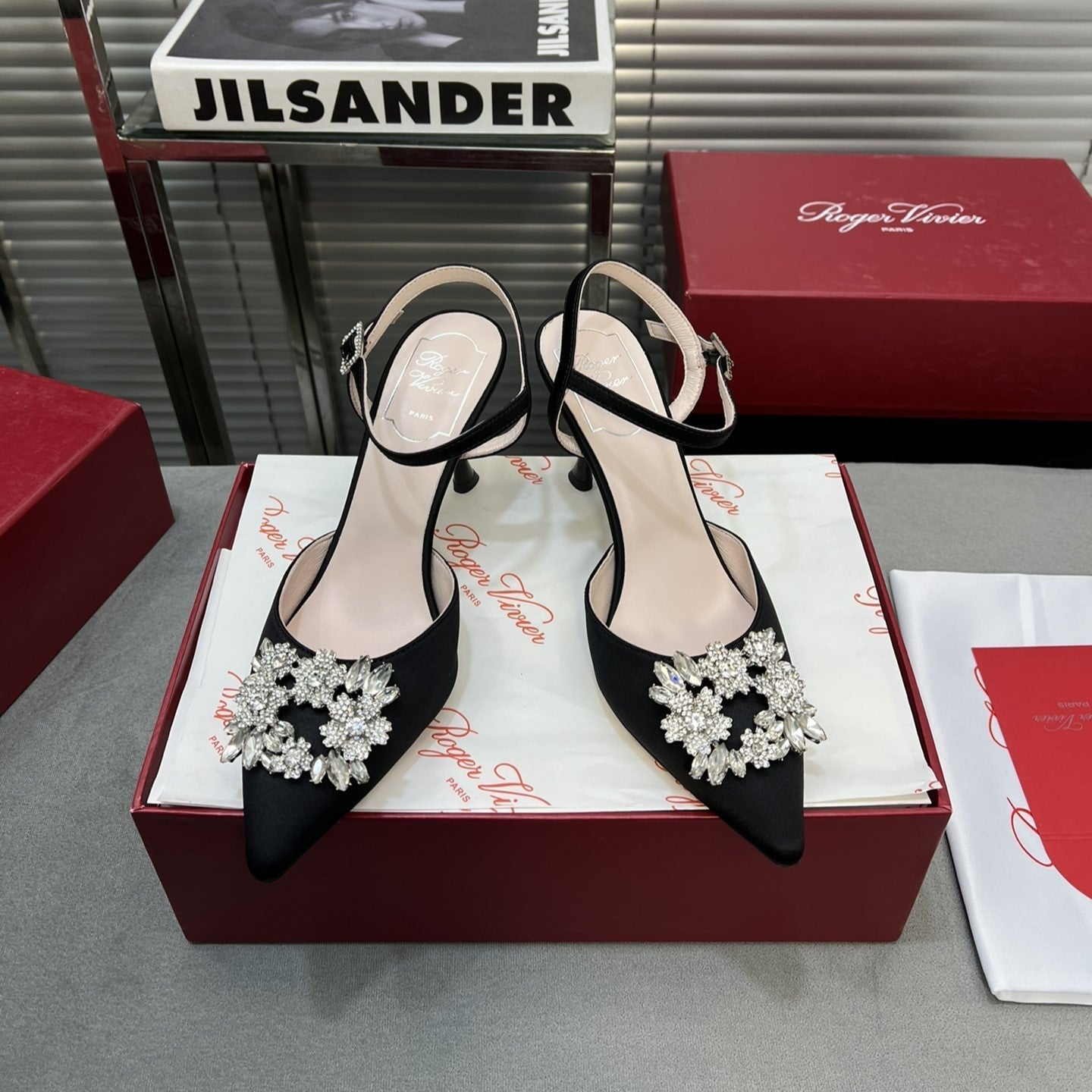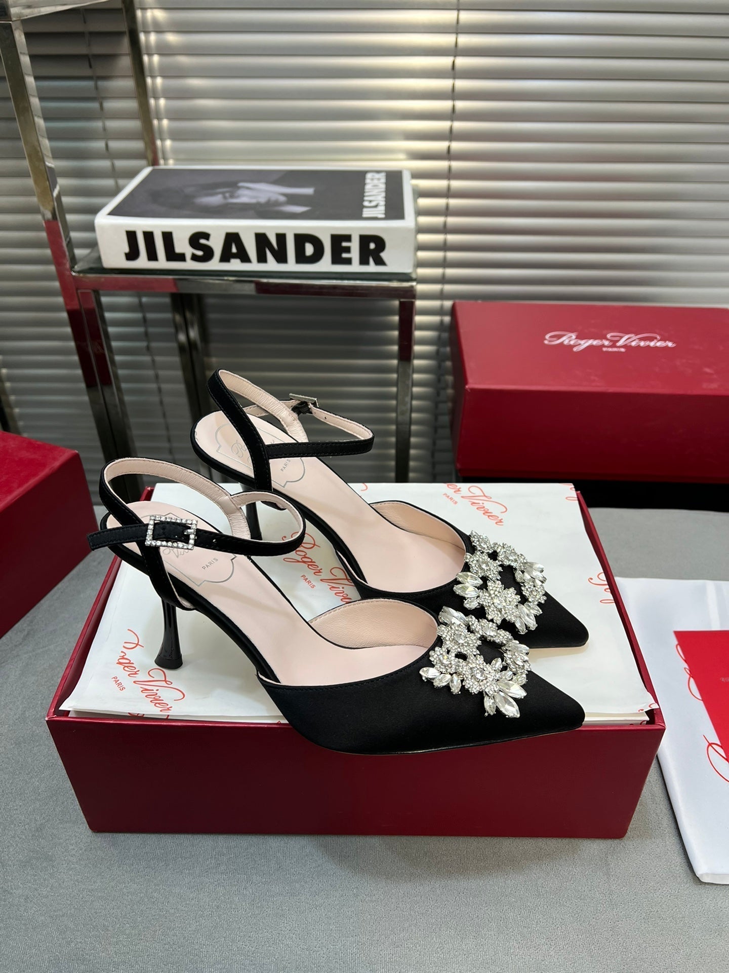 Flower Strass Buckle Slingback Pump 90 Black Satin