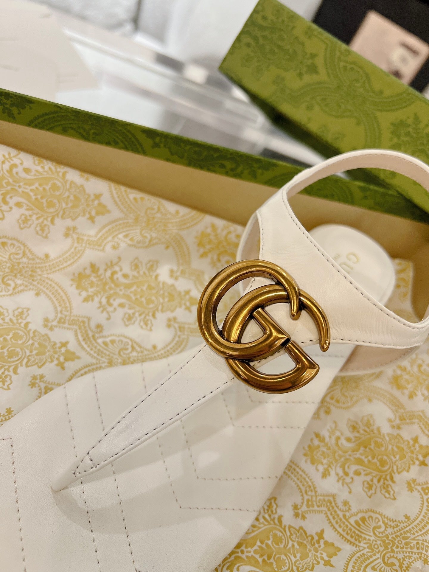 GC Double G Block Heel Thong Sandals White Leather 292408