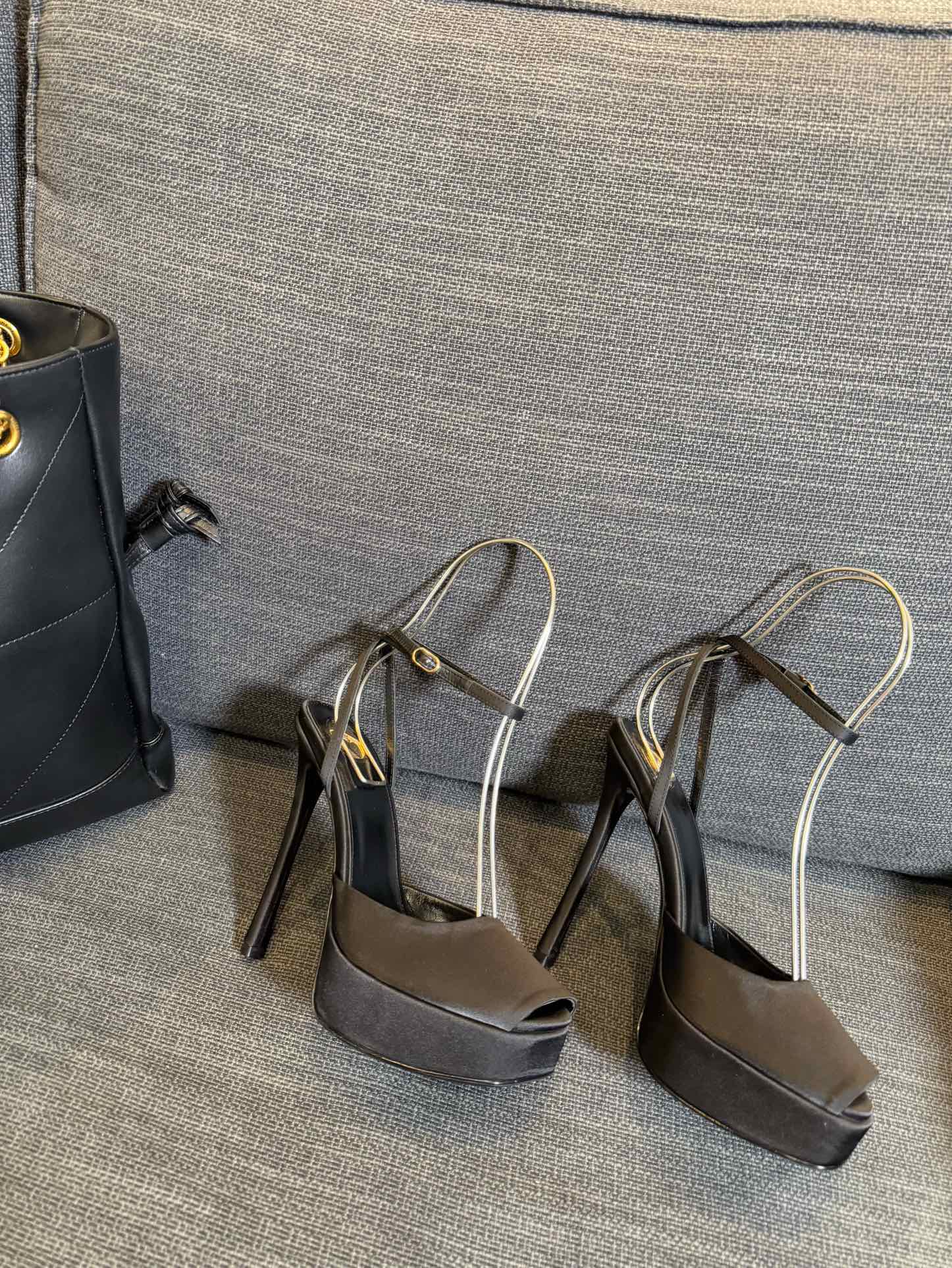 LA SCANDALE PLATFORM SANDALS IN TAUPE BROWN SATIN
